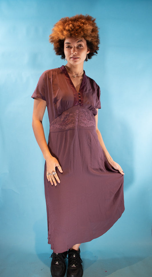 Vintage M/L Laura Ashley Embroidered Crepe Tea Dress in Mauve.