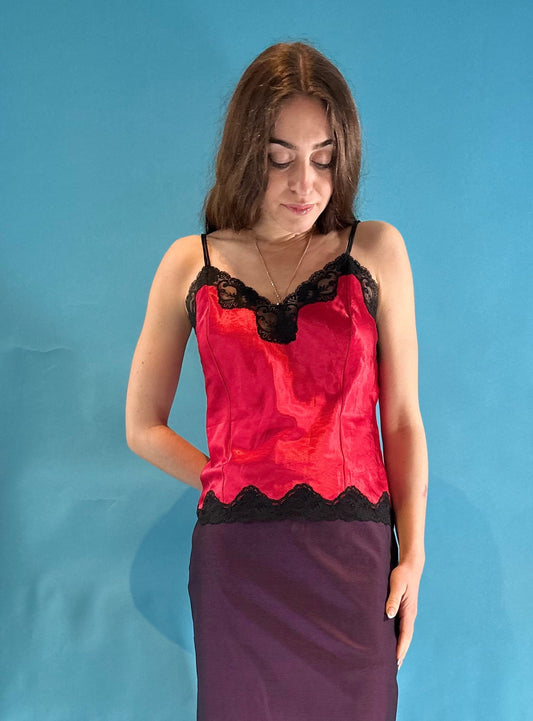 Vintage Y2K Red Satin Cami Slip Top with Lace Trim.