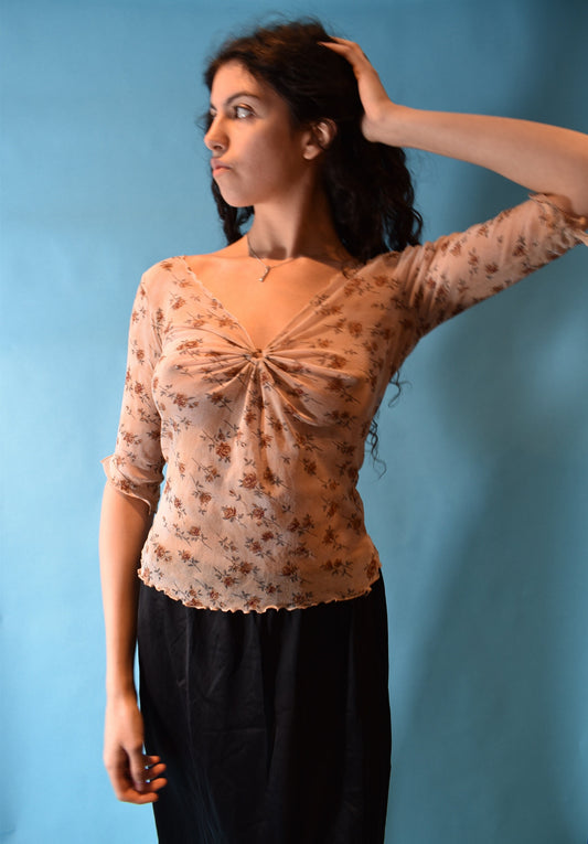 Vintage Y2K Size S/M Floral Sheer Mesh Top in Beige.