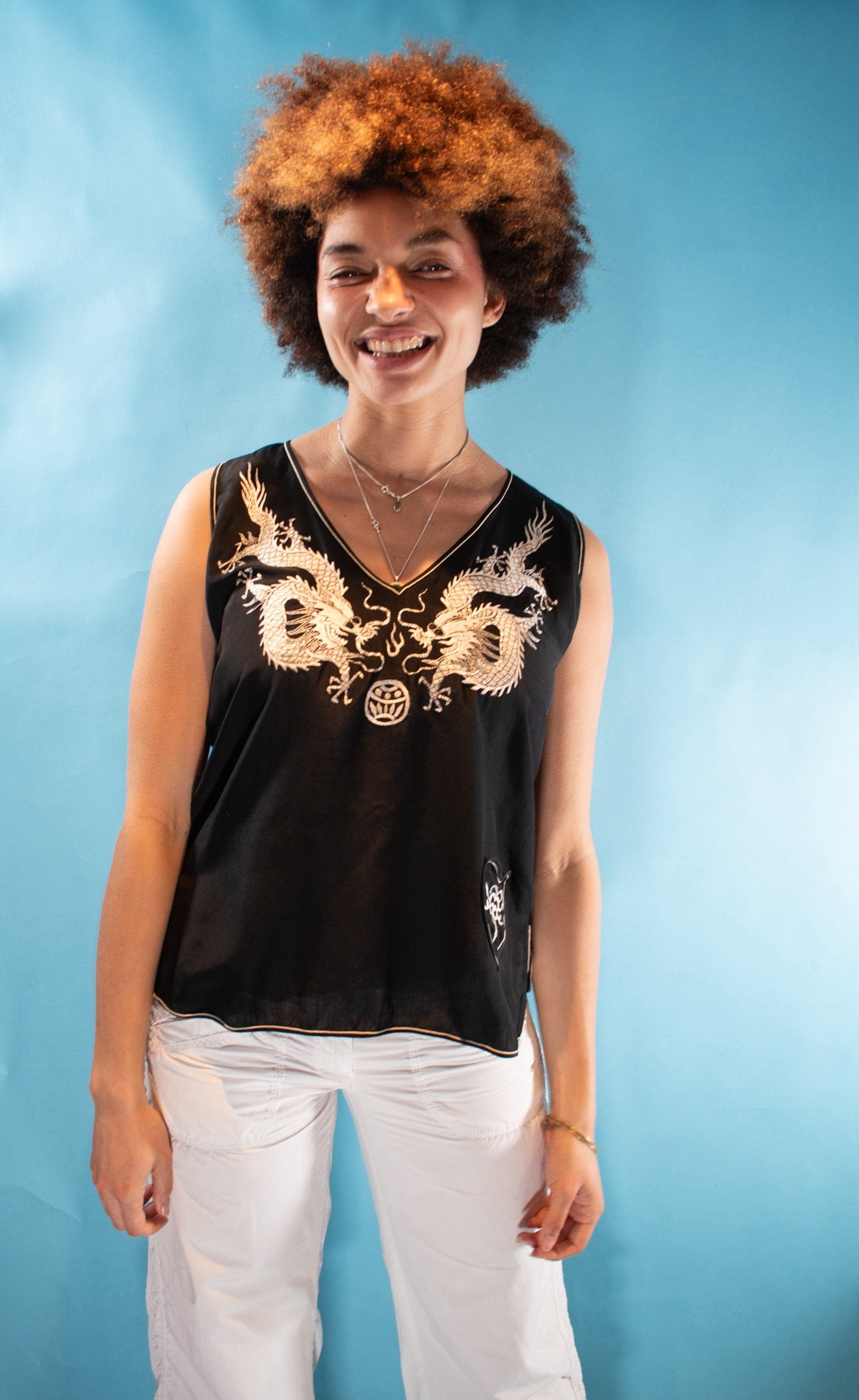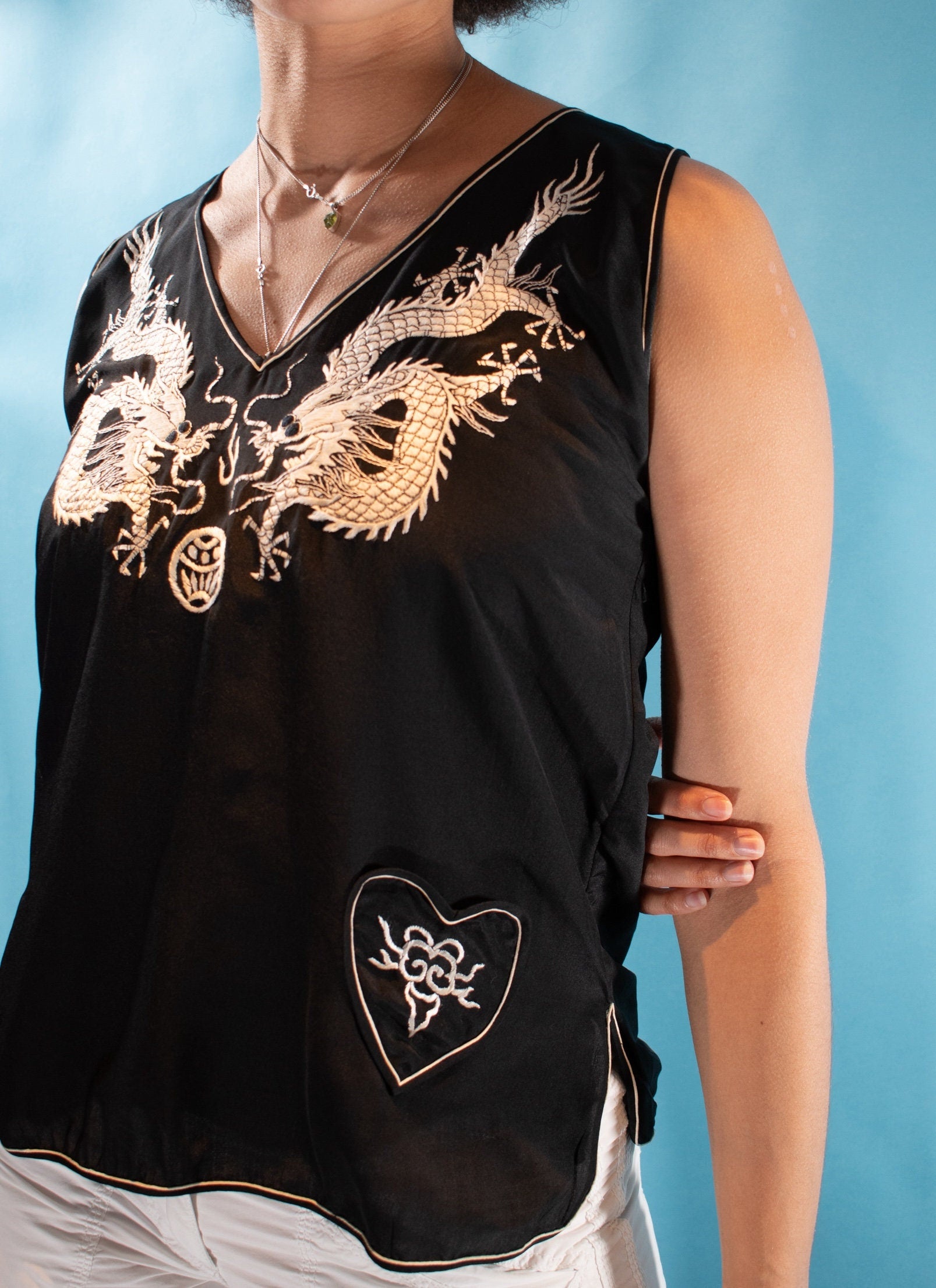 Vintage 1990s M/L Chinoiserie Dragon Embroidered Satin Top in Black & White.