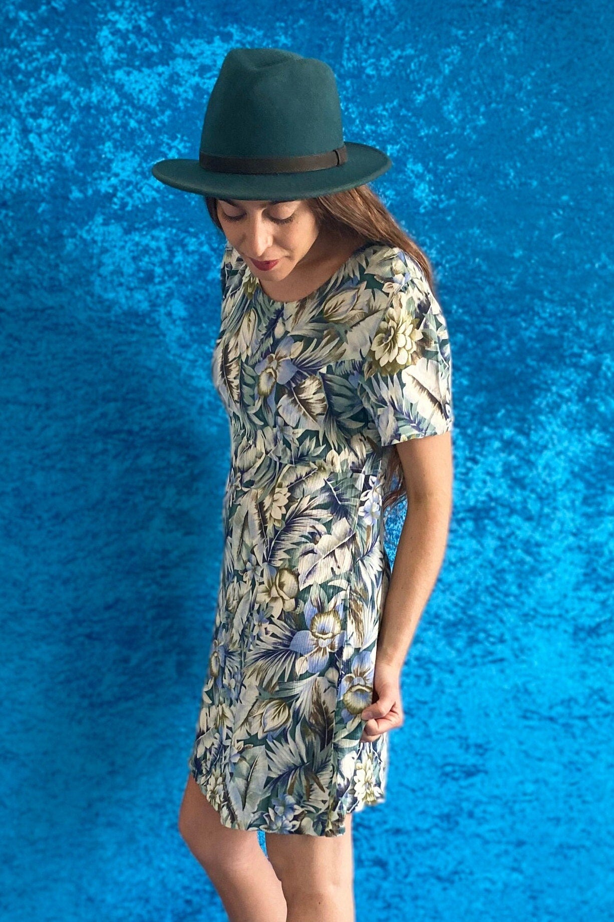 Boho palm leaf print vintage tea dress in beautiful blue and green colourway. Flattering tailoring to show off the waist. Shown here on a UK size 6-8 model. Waist measurement is 33 inches, chest 38 inches and the total length is 33 inches. In excellent vintage condition.