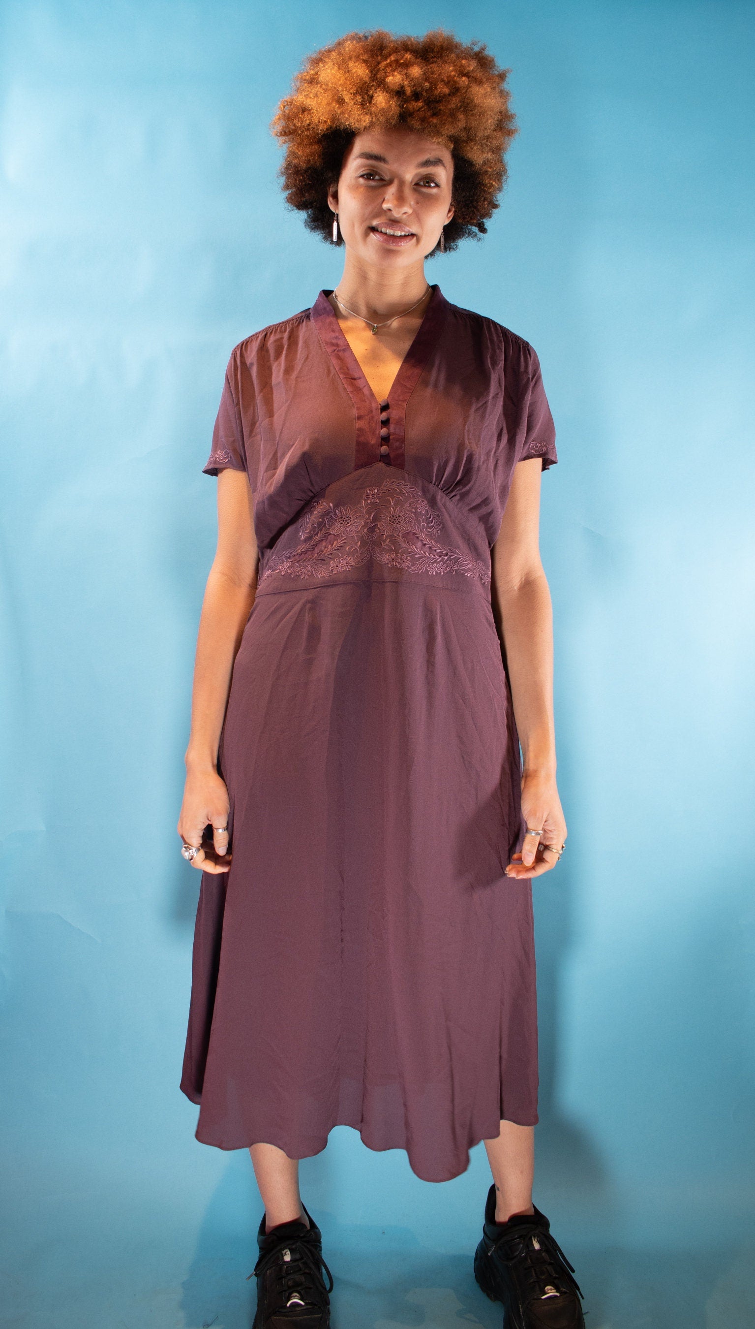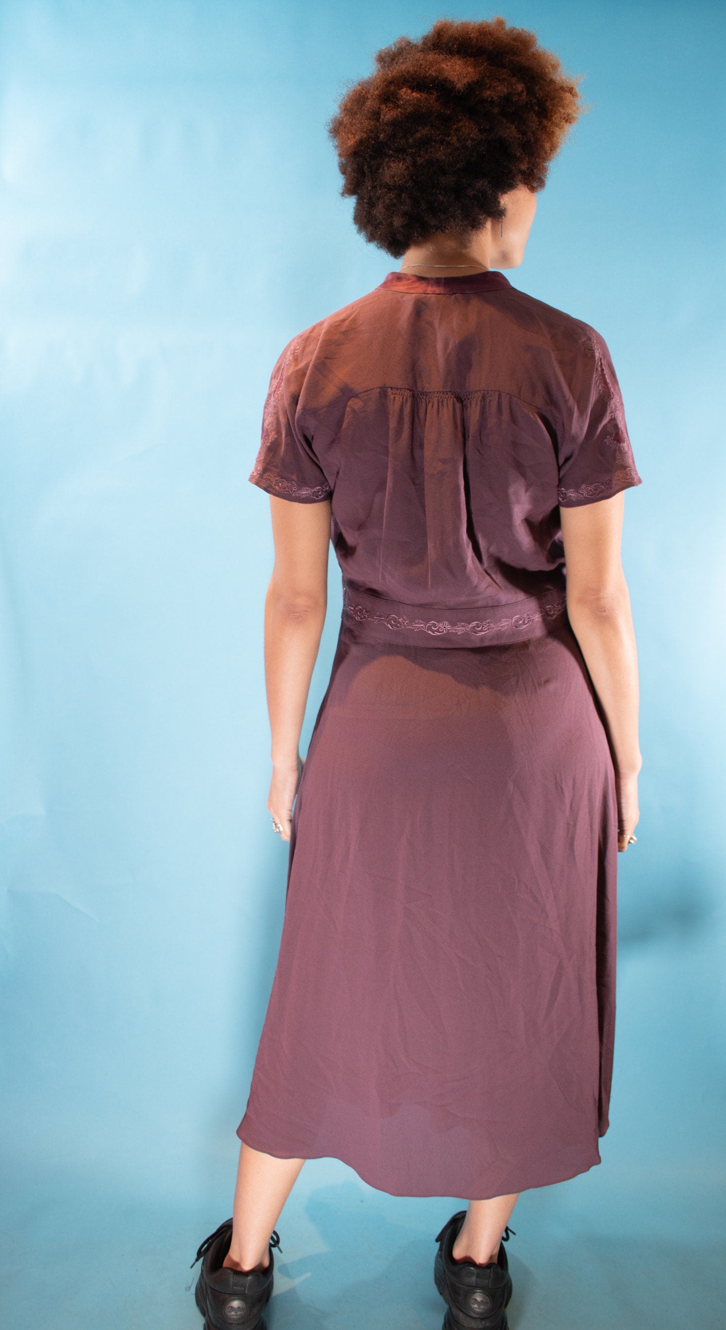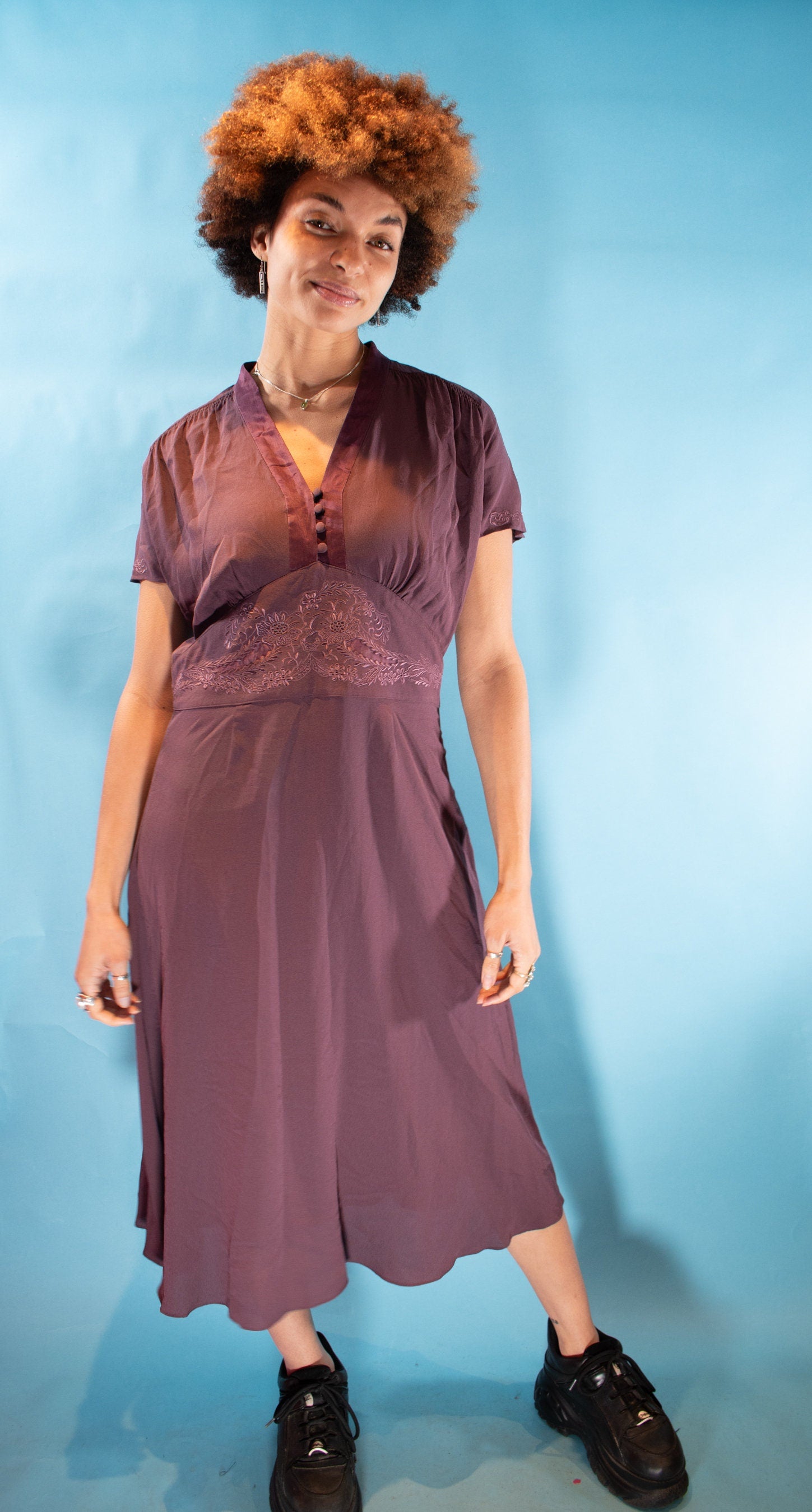 Vintage M/L Laura Ashley Embroidered Crepe Tea Dress in Mauve.