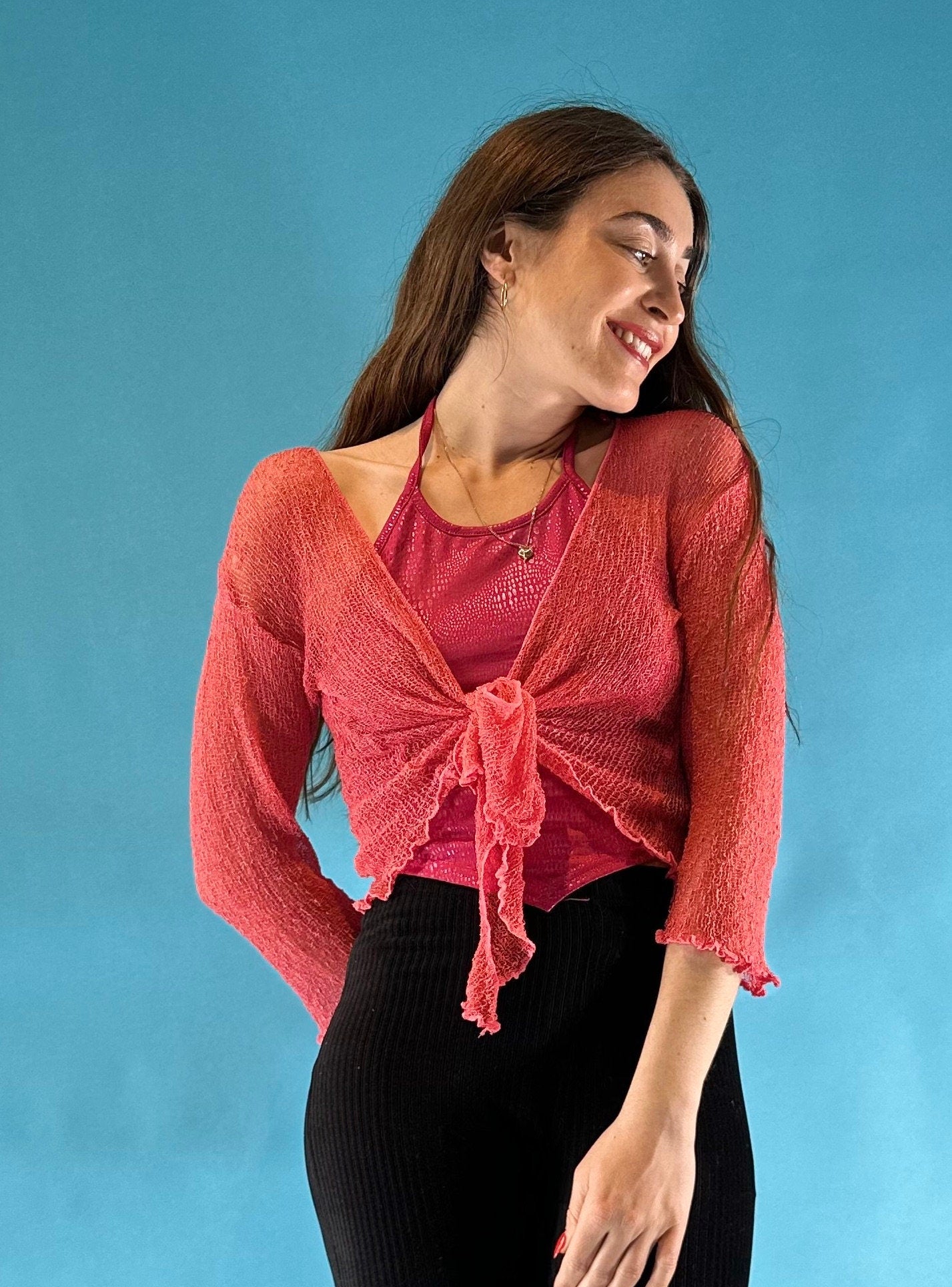 Vintage Y2K 2000s Pink Cropped Crochet Tie Up Cardigan Bolero with 3/4 Length Sleeves.