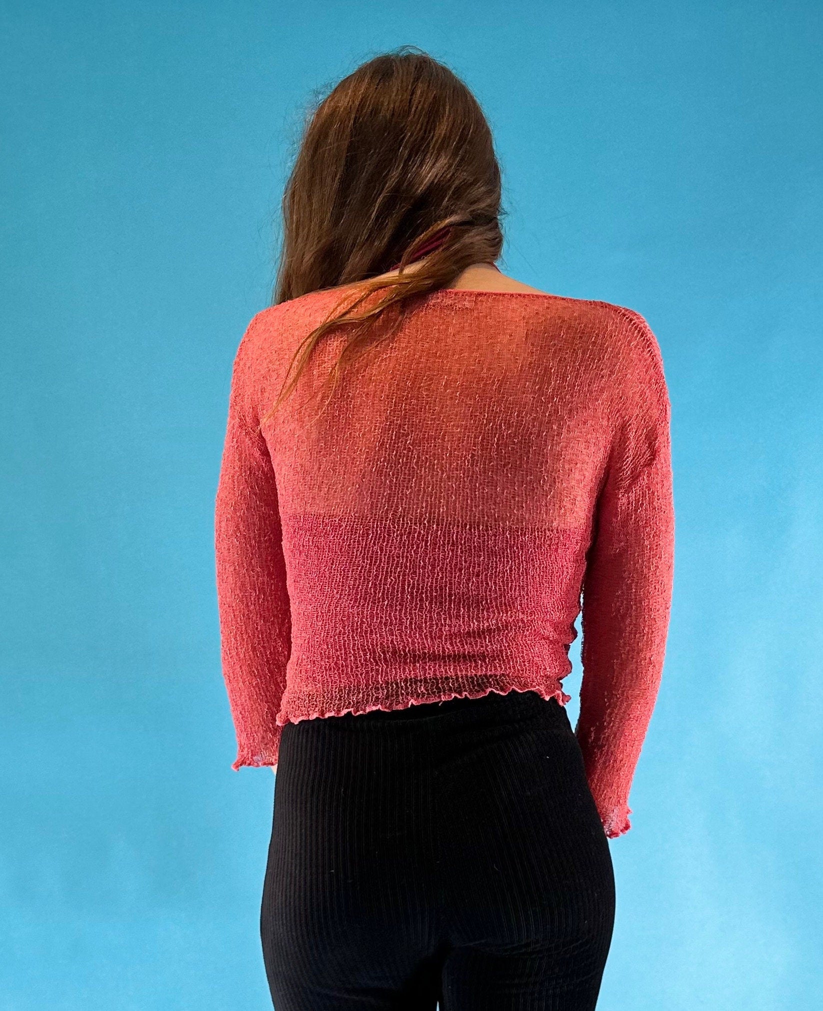 Vintage Y2K 2000s Pink Cropped Knitted Crochet Tie Up Cardigan Bolero with 3/4 Length Sleeves