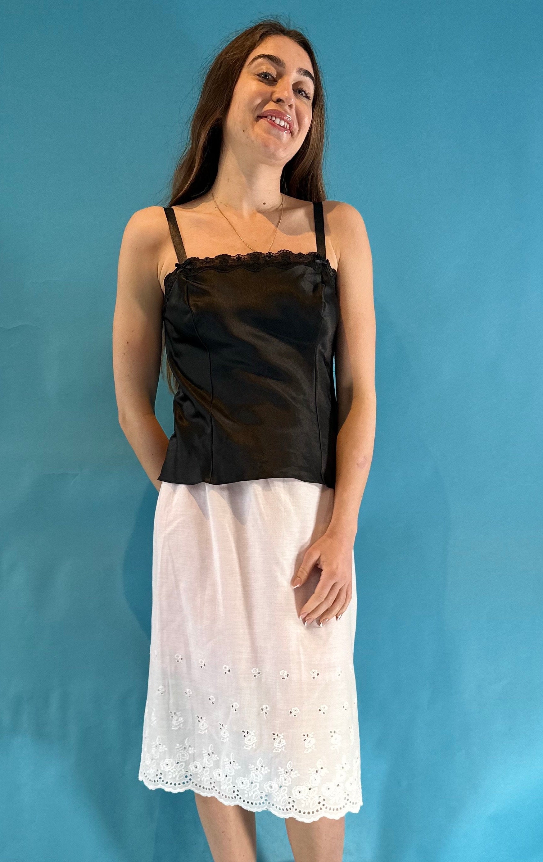 Vintage Y2K Black Square Neck Silk Cami Slip Top with Floral Details