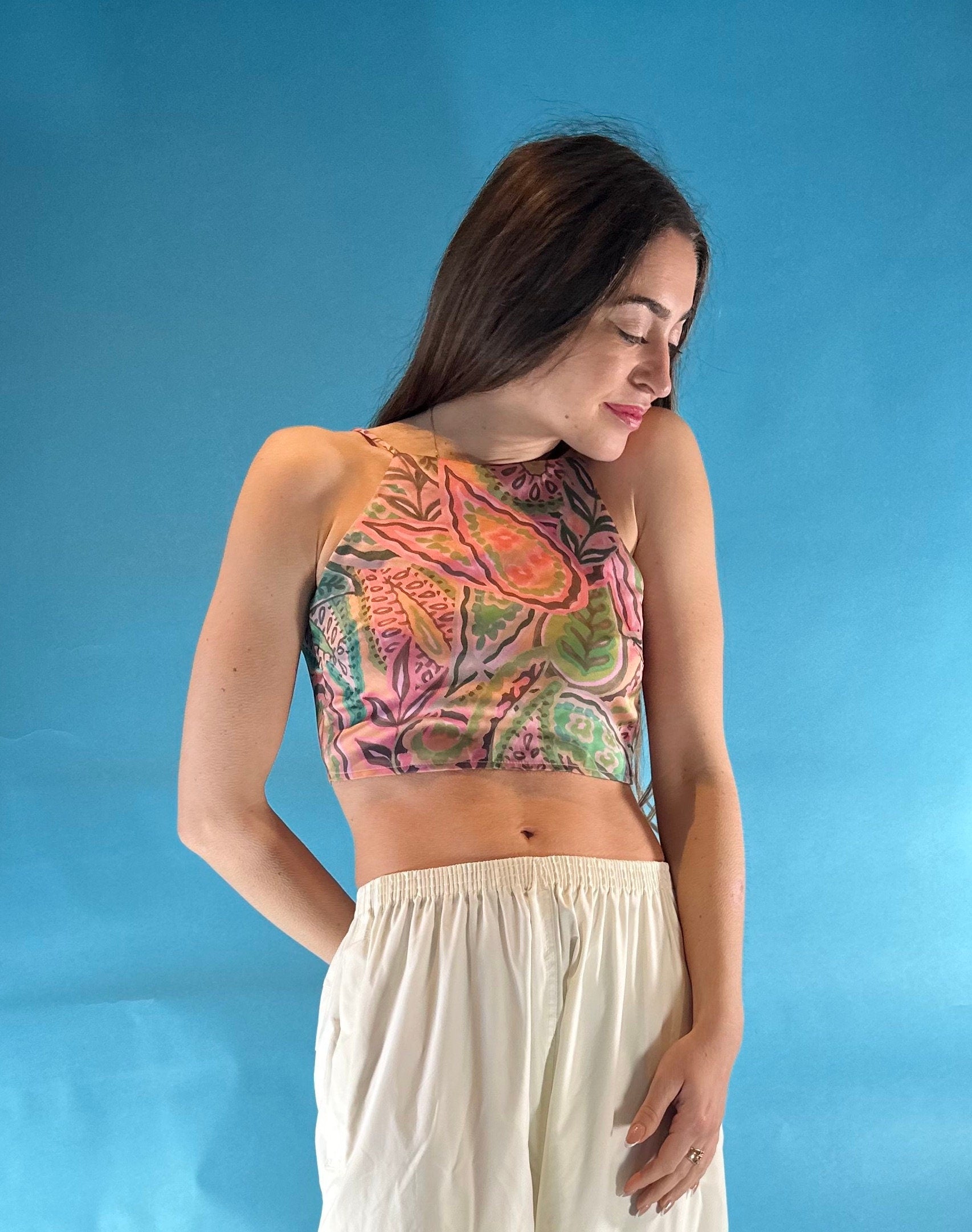 Vintage Y2K Leaf Print Halter Neck Tie Back Crop Top Festival Carnival Ultimate Summer Vibes