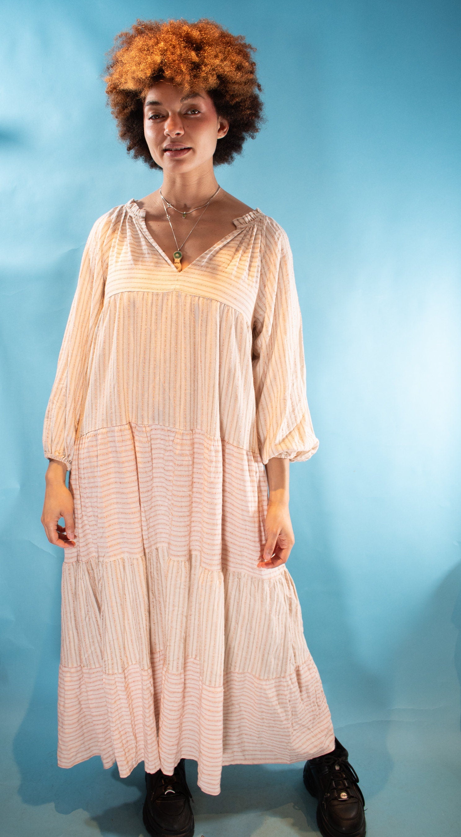 Vintage Y2K M/L Cotton Striped Boho Maxi Dress in Beige and Red.