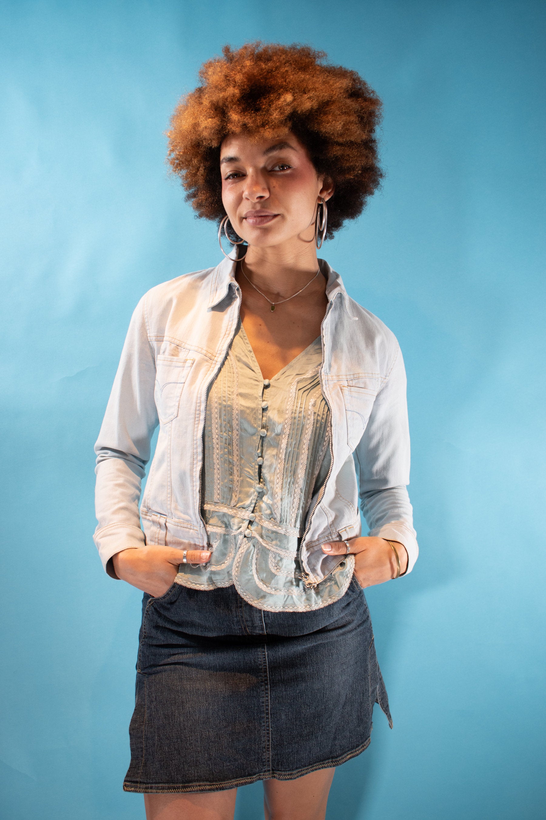 Vintage Y2K S Zip Up Cropped Denim Jacket in Light Wash Blue.