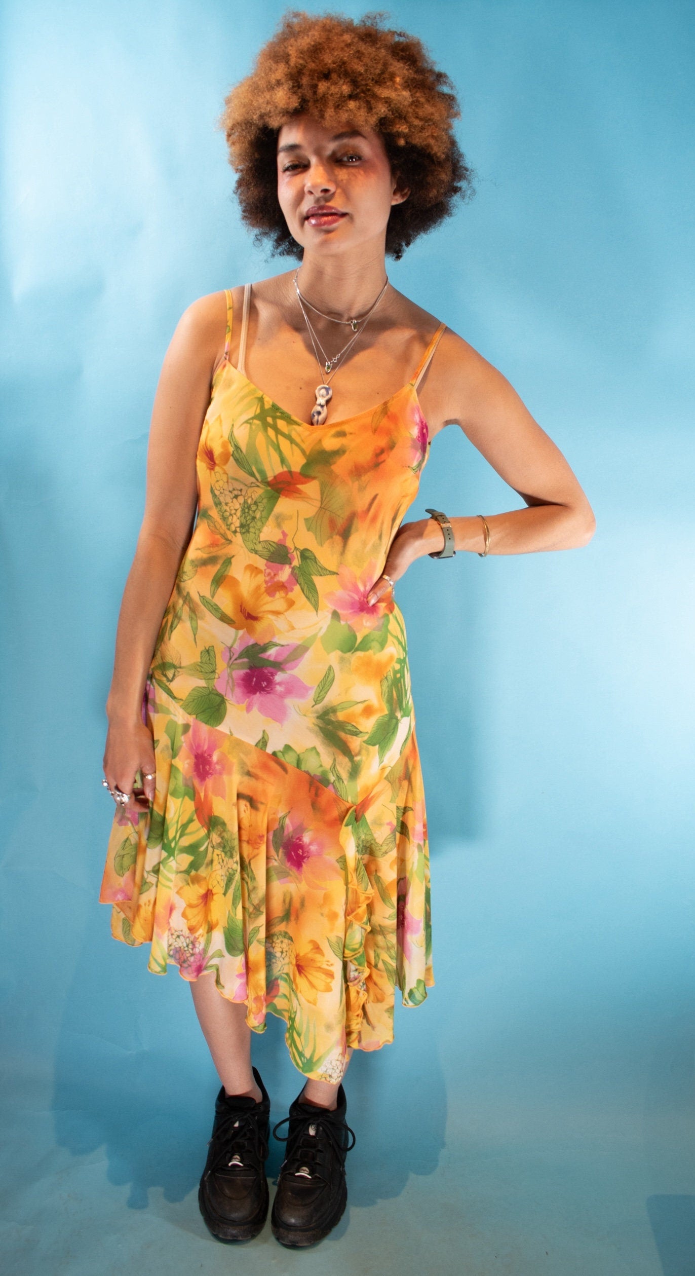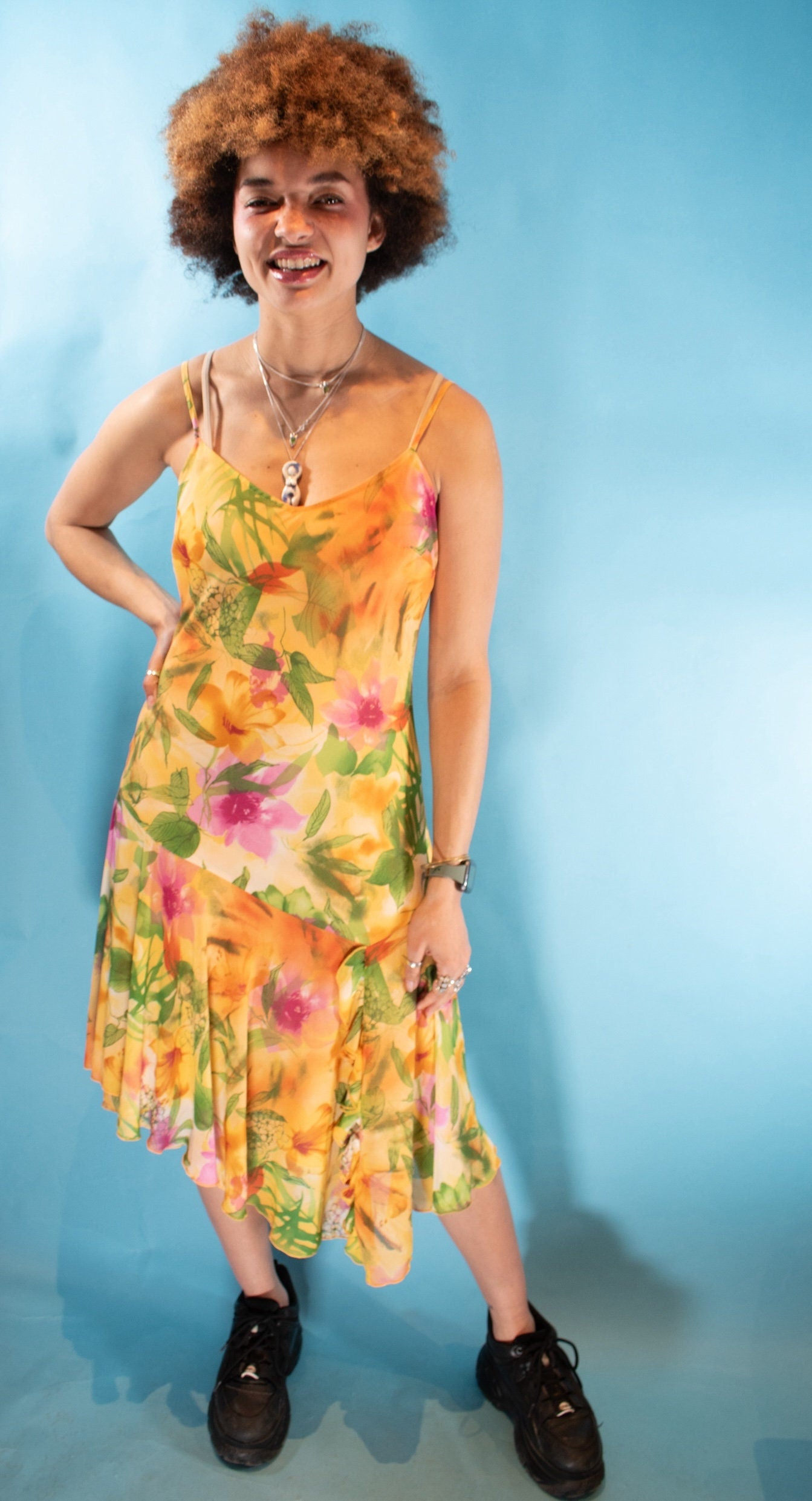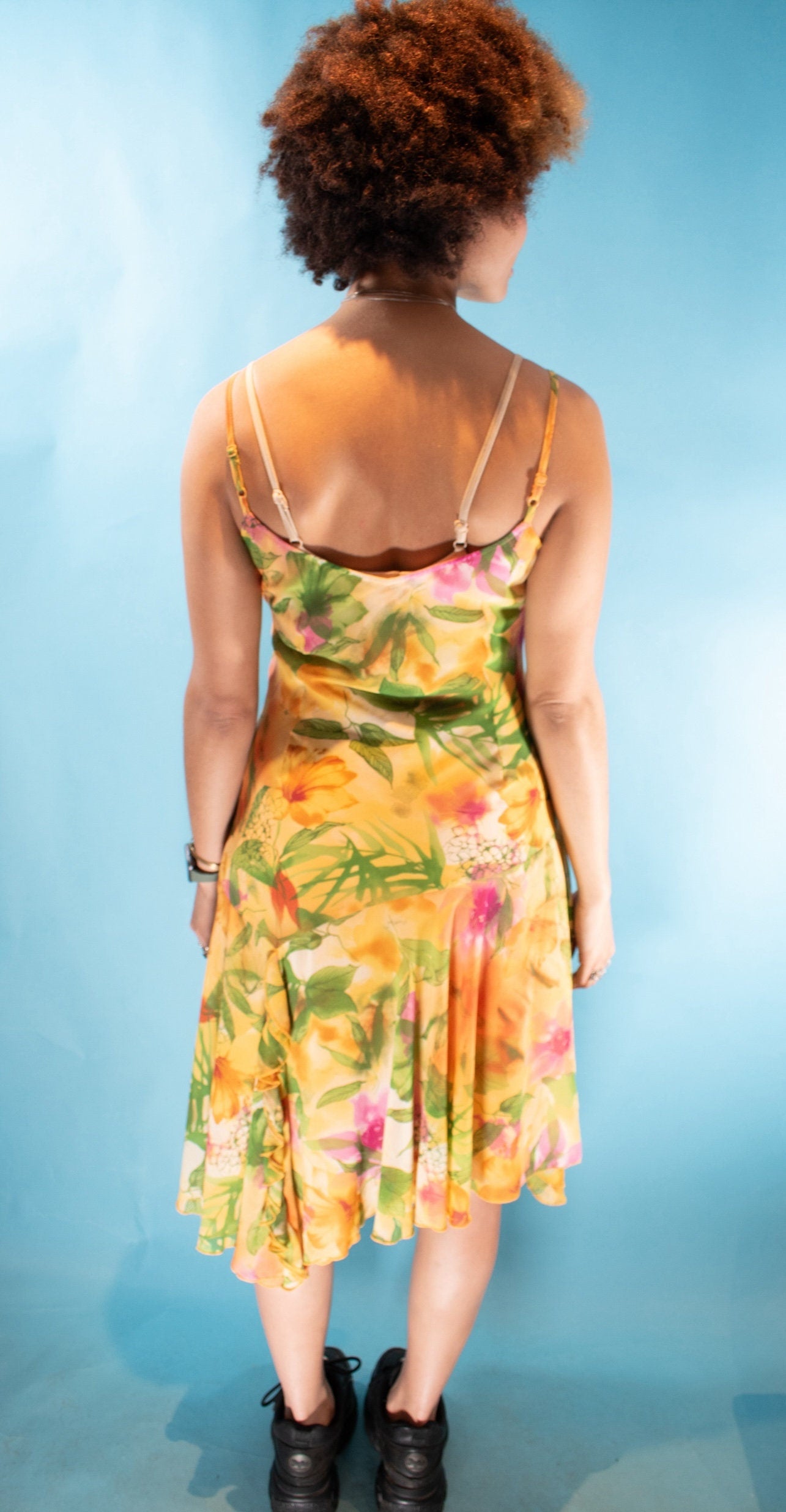 Vintage Y2K Size M Tropical Print Asymmetric Summer Dress in Yellow.